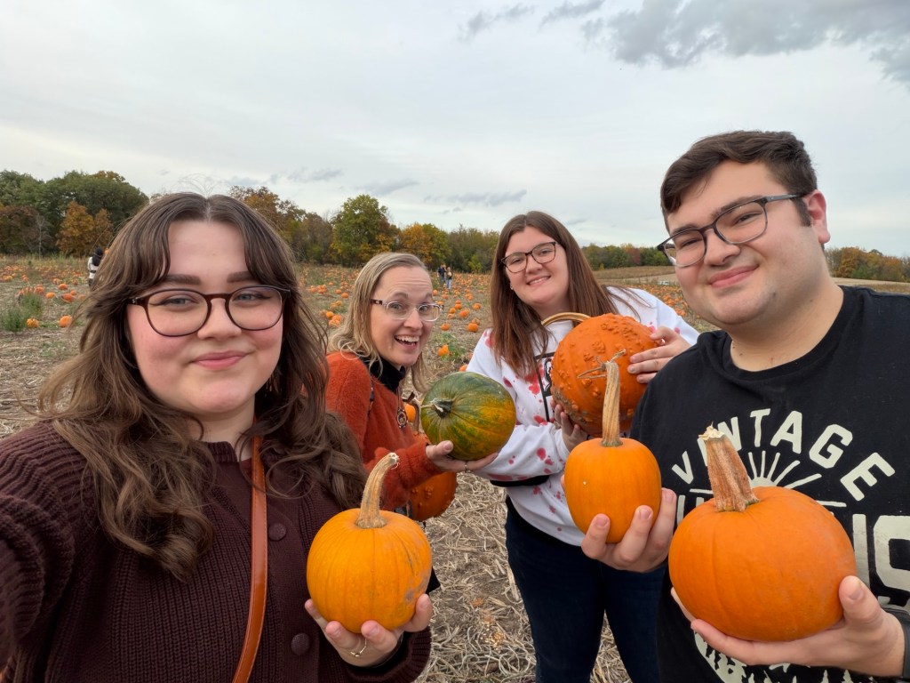 We went to Schuster’s farm for their pumpkin patch and corn maze. We also played blind volleyball- where they had a wooden block so you couldn’t see each other which was hilarious!